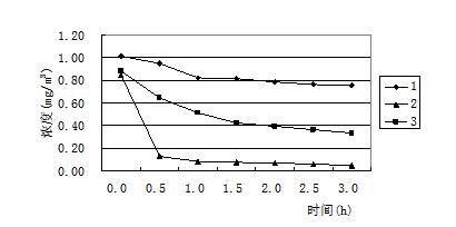 圖2 比較(圖2)中的三條凈化效率曲線可以看出,在相同的測試條件下,使用相同的技術,但是凈化效率卻有很大差異,2號產品能使甲醛濃度迅速下降,1h內即達到0.1mg/m3以下,可是1號產品在開啟3h后,甲醛濃度依舊在0.7mg/m3以上。許多研究表明,光催化可以在常溫常壓下即可將空氣中的有害氣體分解成無毒物質[7],而且沒有二次污染,是一種有效的去除各種室內污染物的先進技術,但在我們測試的同時檢測環境艙內的臭氧濃度,發現臭氧濃度在光催化技術的凈化器凈化過程中均有不同程度的升高。這說明在考慮選擇光催化凈化產品的同時,不應該忽視其副產物臭氧的存在。另外光催化產品還存在催化劑失活的現象。催化失活是指催化劑表面被反應產物或顆粒物覆蓋,失去催化效果,必須及時更換核心部件。因此如何選擇副產物的生成量較小,并且壽命較長的催化產品是催化劑類凈化器選型的關鍵。同一臺凈化機改進前后凈化效率的比較 由于同種技術的凈化效果會因為設計工藝或者制造技術的不同形成較大差異,所以很多凈化器廠家也在不停的改進生產,希望可以得到效果好、副產物少、壽命長的產品。圖3中表示的是一家使用復合式技術廠家生產的凈化產品,主要采用的技術有過濾、吸附、高壓靜電和負離子,(圖1、2、3)中曲線分別是同一臺凈化器未經過改進和兩次改進后得到的凈化效率曲線,三次試驗時凈化器內部結構基本相同,只是在關鍵技術處做出調整,測試時得出的凈化效率有明顯差異。從圖中可以清晰的看出,三條凈化效率曲線明顯由低到高,說明關鍵技術的調試對凈化器的凈化效率有顯著影響。
